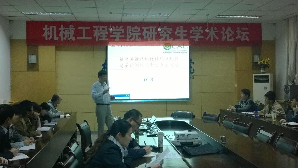 我院薛河教授以“核電關(guān)鍵材料環(huán)境致裂定量預(yù)測(cè)研究中的力學(xué)問(wèn)題”作了首場(chǎng)報(bào)告。其后,青年教師王川偉博士作了題為“礦井救援機(jī)器人應(yīng)急無(wú)線通訊系統(tǒng)構(gòu)建”的報(bào)告,碩士生郭駿以“礦井主通風(fēng)機(jī)設(shè)備故障預(yù)警及安全評(píng)價(jià)研究”為題作了報(bào)告交流。