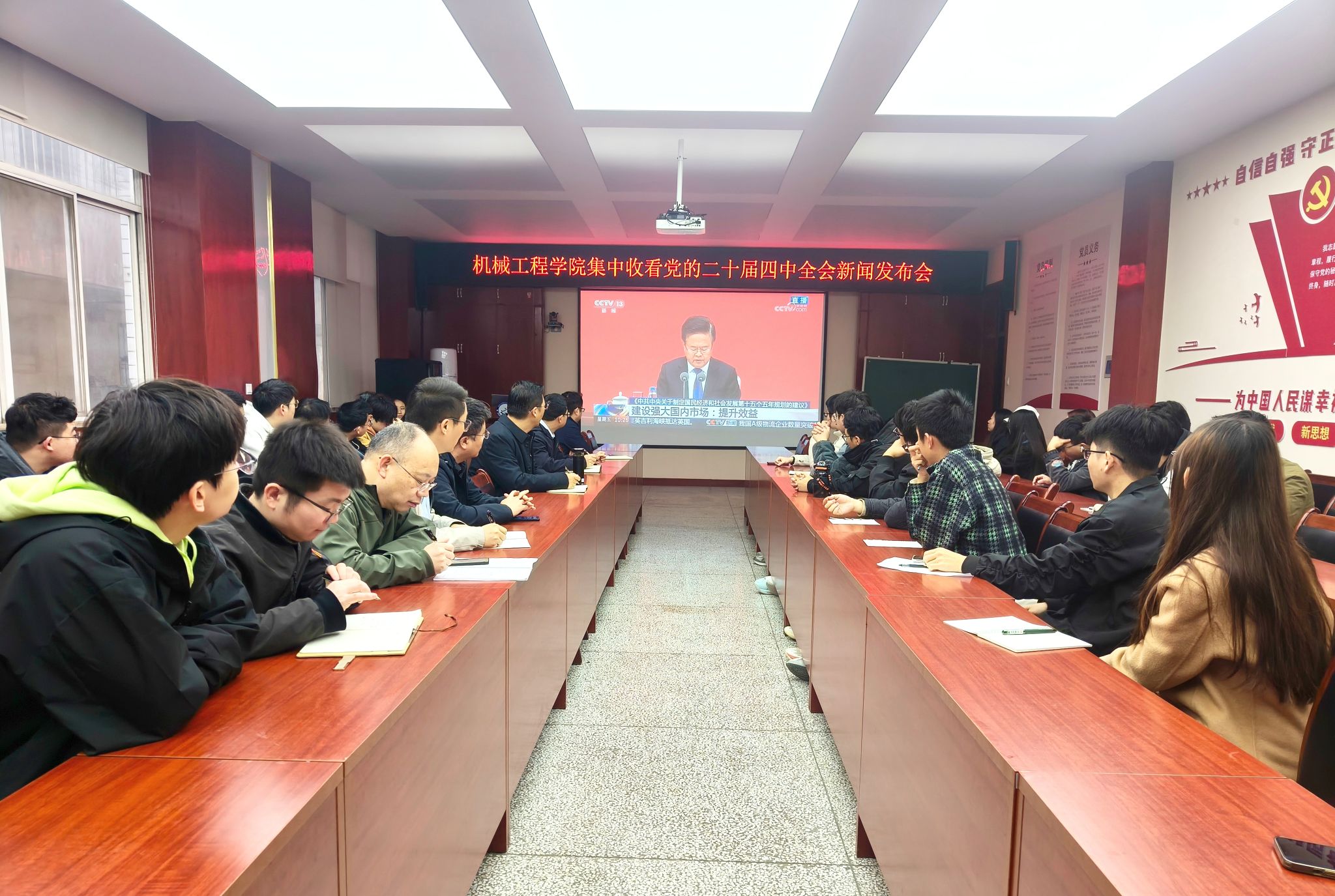 2025年10月24日上午,機械工程學(xué)院在雁塔校區(qū)北院210會議室組織師生集中收看黨的二十屆四中全會新聞發(fā)布會,認(rèn)真學(xué)習(xí)黨的二十屆四中全會精神。學(xué)院班子成員、黨支部書記、系主任、教師代表和研究生黨員代表80余人共同收看。