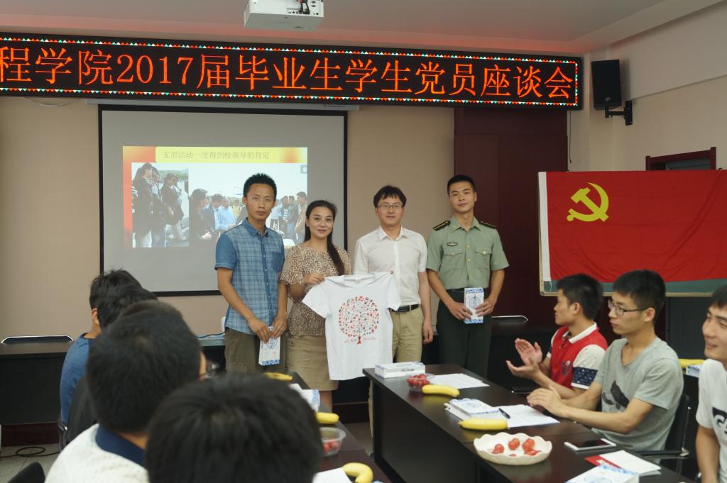 最后,李婉麗做會議總結(jié),感謝同學(xué)們能夠毫無保留地為母校的建設(shè)和發(fā)展建言獻(xiàn)策,并對同學(xué)們提出了希望和要求。一是希望同學(xué)們牢記黨員的責(zé)任和義務(wù),做一名合格共產(chǎn)黨員;二是不斷堅持學(xué)習(xí),爭做優(yōu)秀畢業(yè)生;三是珍惜校園生活,做文明離校表率,希望同學(xué)們畢業(yè)后繼續(xù)關(guān)心和支持母校的建設(shè)和發(fā)展。畢業(yè)生代表向?qū)W院贈送了班級畢業(yè)T恤以及年級合影,為本次座談會畫上圓滿的句號。