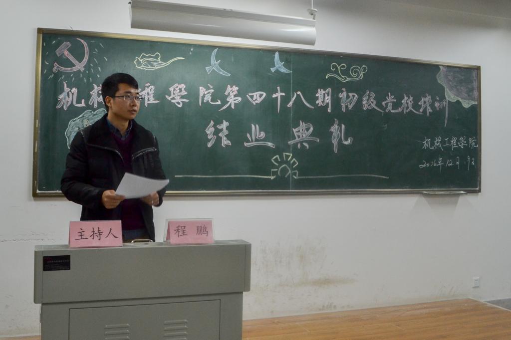 典禮由程鵬老師主持,在《國際歌》中拉開序幕,首先,程鵬老師通報了第四十八期初級黨校的培訓(xùn)以及結(jié)業(yè)情況,經(jīng)過理論授課,自學(xué)討論,日常考核,結(jié)業(yè)考試等環(huán)節(jié),共記五講,十個課時,104人順利結(jié)業(yè),評選出5名優(yōu)秀學(xué)員。然后,由輔導(dǎo)員老師們?yōu)楸敬纬跫夵h校結(jié)業(yè)學(xué)員代表頒發(fā)結(jié)業(yè)證書,黨委副書記李婉麗老師為優(yōu)秀學(xué)員頒發(fā)榮譽證書。最后,李婉麗老師發(fā)表了講話,對順利結(jié)業(yè)的同學(xué)表示了祝賀,對第四十八期黨校的組織和授課老師表示了感謝,同時向全體學(xué)員提出了希望:初黨只是組織發(fā)展的第一步,學(xué)員應(yīng)發(fā)揮模范帶頭作用,深刻認識學(xué)習(xí)馬克思主義,不斷提高自身的黨性修養(yǎng),為早日加入中國共產(chǎn)黨做好充分準備。