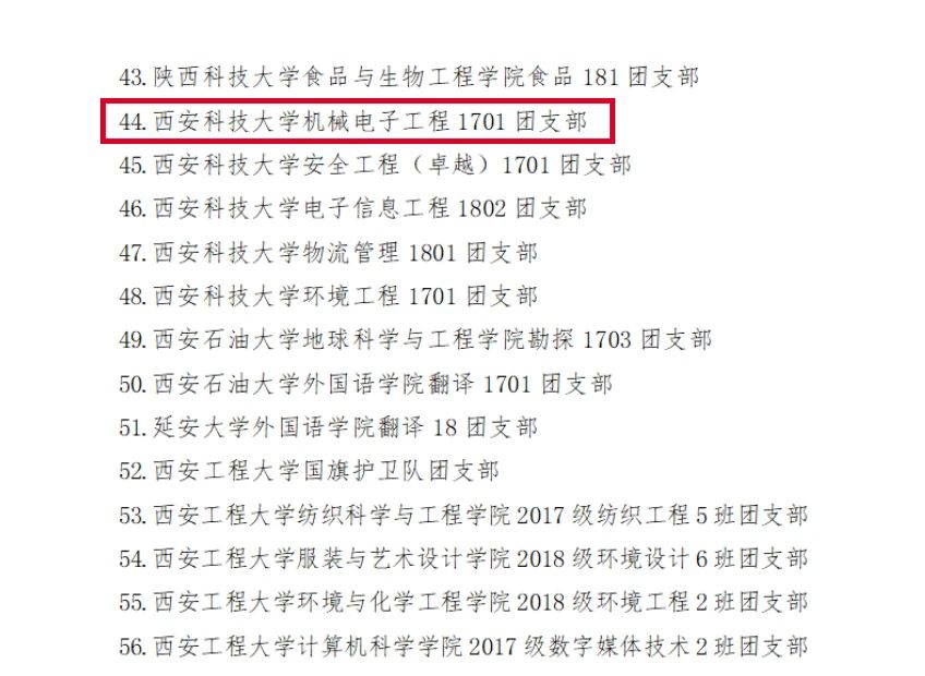 2020年5月13日,由共青團(tuán)陜西省委辦公室,中共陜西省委教育工委辦公室公布的關(guān)于第一批全省高校團(tuán)建示范院校,標(biāo)桿院系,樣板支部培育創(chuàng)建名單中,西安科技大學(xué)機(jī)械工程學(xué)院團(tuán)委被評為“全省高校團(tuán)建標(biāo)桿院系”。