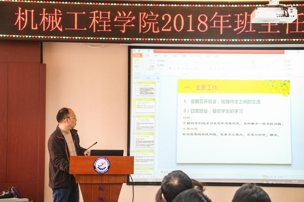 2018年11月1日,機械工程學院在臨潼校區(qū)驪山校園召開班主任工作培訓會以及班主任經(jīng)驗分享會。2018級新生班主任和輔導員參加了會議,會議由院黨委副書記李婉麗主持。