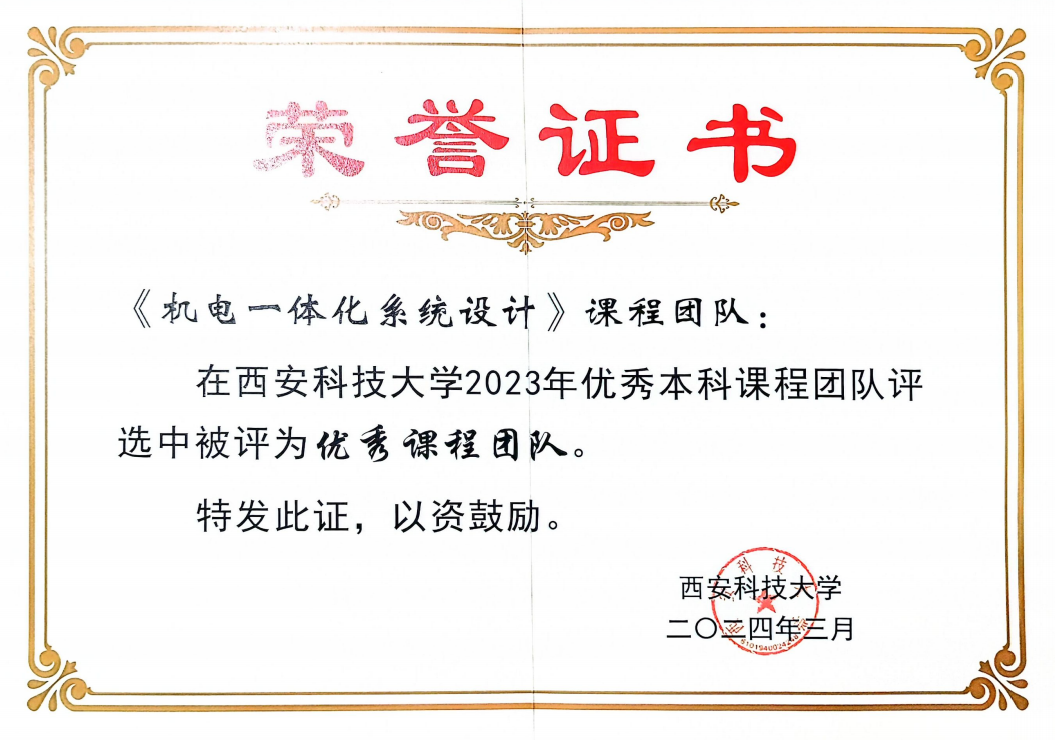西安科技大學(xué)機(jī)械工程學(xué)院《機(jī)電一體化系統(tǒng)設(shè)計(jì)》課程組在張旭輝教授、樊紅衛(wèi)副教授帶領(lǐng)下,堅(jiān)持為黨育人,為國(guó)育才,立德樹(shù)人根本宗旨,從教材編寫(xiě)到課程建設(shè),開(kāi)展了全方位的教育教學(xué)改革,入選了陜西省一流課程,支撐了機(jī)械電子工程專(zhuān)業(yè)入選國(guó)家級(jí)一流專(zhuān)業(yè)建設(shè)點(diǎn)。主要建設(shè)成果如下: