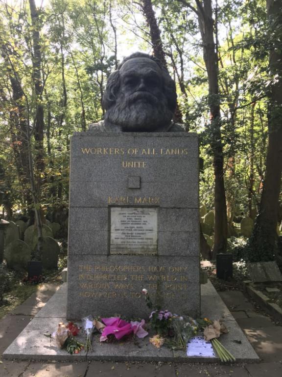 墓碑前放置著許多鮮花,眼前的馬克思墓碑在經歷了歲月的飄搖,依然莊嚴肅穆地矗立在這里,遙望遠方,就如同我們相信共產主義終將到來。在墓碑下我們駐足仰視,獻上了我們的崇敬,也留下了我們的懷念。在這個安靜祥和的地方,我們從未與馬克思這樣近,膚色各異的人們紛紛駐足,瞻仰著馬克思,似乎在告訴我們真正的偉人是不會被忘記的,他的學說和他的安息之地一樣激勵著人們直面困難,不斷前行。