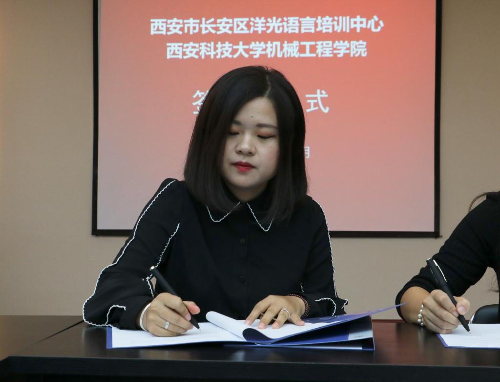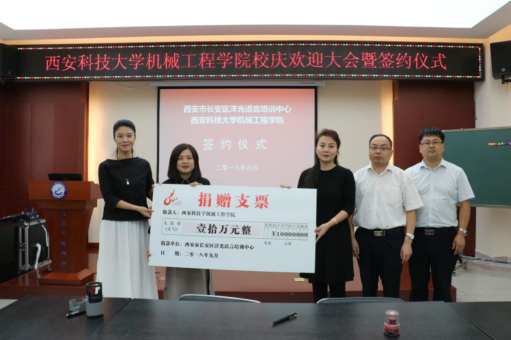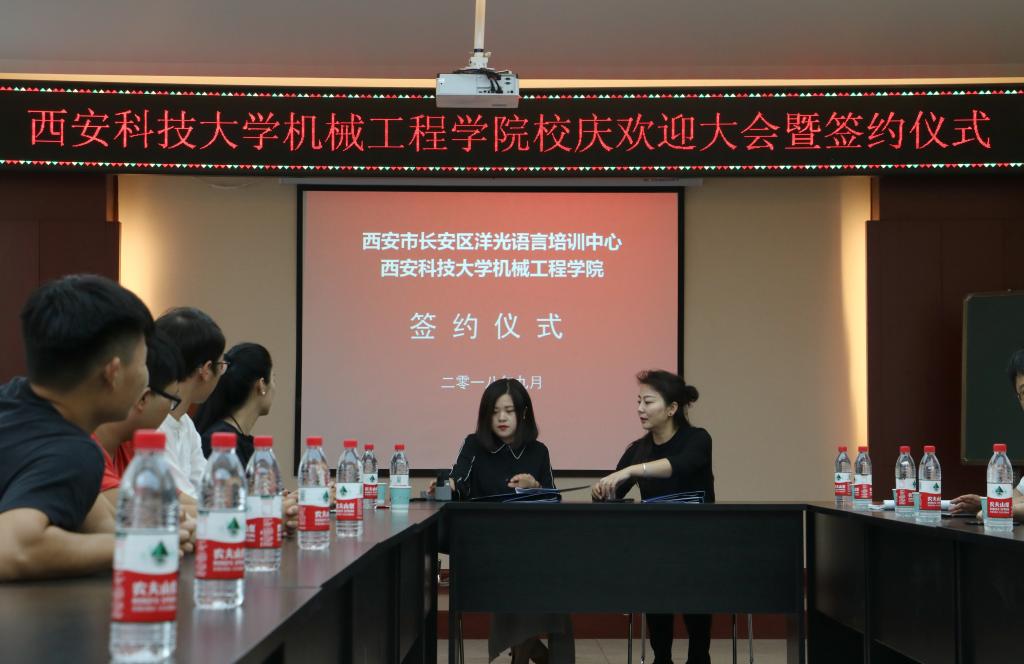 2018年9月14日上午,洋光外語外語培訓(xùn)機構(gòu)一行人赴機械工程學(xué)院簽署陽光外語—西安科技大學(xué)機械工程學(xué)院企業(yè)捐贈協(xié)議,簽約儀式在臨潼校區(qū)機械學(xué)院會議室進行,儀式前雙方就人才培養(yǎng)、外語教學(xué)等議題進行了友好深入的交流,并由洋光外語培訓(xùn)機構(gòu)與機械工程學(xué)院分別代表兩家單位簽署了捐贈協(xié)議。參會的學(xué)院領(lǐng)導(dǎo)有機械學(xué)院黨委書記汪衛(wèi)兵、院長張旭輝、黨委副書記李婉麗、副院長寇發(fā)榮,學(xué)院30余名師生也參加了簽約儀式。