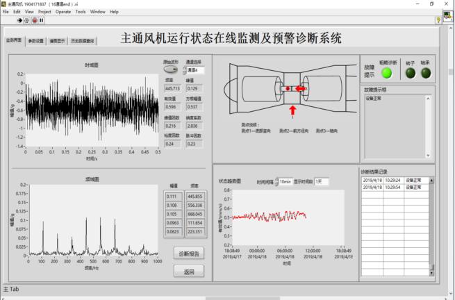 開(kāi)發(fā)的“煤礦主通風(fēng)機(jī)狀態(tài)監(jiān)測(cè)與故障診斷系統(tǒng)”如圖1所示。為了實(shí)時(shí)監(jiān)控煤礦主通風(fēng)機(jī)的運(yùn)行狀態(tài),設(shè)計(jì)了振動(dòng)在線監(jiān)測(cè)與故障診斷系統(tǒng)。系統(tǒng)接入振動(dòng)信號(hào),多個(gè)通道同步采集振動(dòng)信息,經(jīng)信號(hào)預(yù)處理后分別進(jìn)行時(shí)域和頻域分析;結(jié)合設(shè)備實(shí)際運(yùn)行狀況,設(shè)置故障閾值以判斷設(shè)備當(dāng)前狀態(tài)和故障情況。在某煤礦主通風(fēng)機(jī)上進(jìn)行了生產(chǎn)現(xiàn)場(chǎng)應(yīng)用驗(yàn)證,實(shí)際提取的通風(fēng)機(jī)特征頻率與理論計(jì)算值誤差小于5%,證明系統(tǒng)功能正常、數(shù)據(jù)分析準(zhǔn)確可靠。