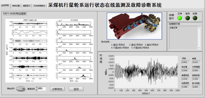 開(kāi)發(fā)的“采煤機(jī)狀態(tài)監(jiān)測(cè)與故障診斷系統(tǒng)”如圖1所示。系統(tǒng)功能包括數(shù)據(jù)采集、信號(hào)處理功能、故障診斷功能、數(shù)據(jù)管理功能及輔助功能。搭建試驗(yàn)平臺(tái),模擬了齒輪裂紋故障,利用開(kāi)發(fā)的系統(tǒng)實(shí)時(shí)監(jiān)測(cè)并診斷輪系運(yùn)行狀態(tài),結(jié)果表明,太陽(yáng)輪出現(xiàn)齒根裂紋時(shí)振動(dòng)信號(hào)幅值頻譜圖中嚙合頻率、太陽(yáng)輪故障特征功率及其組合頻率處峰值突出,證明所構(gòu)建的輪齒裂紋動(dòng)力學(xué)模型是可行有效的,時(shí)頻信號(hào)分析方法是可靠實(shí)用的,狀態(tài)監(jiān)測(cè)及故障診斷軟件運(yùn)行穩(wěn)定可靠。