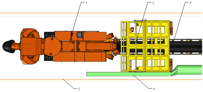 1-掘進(jìn)機(jī)器人 2-履帶式龍門鉆錨機(jī)器人 3-二運(yùn)皮帶 4-風(fēng)筒 5-巷道